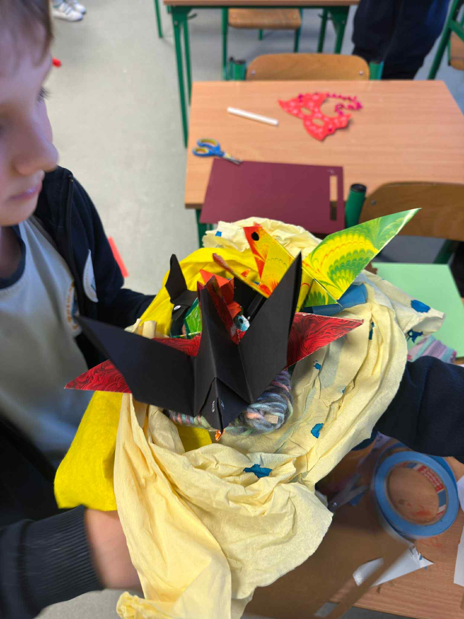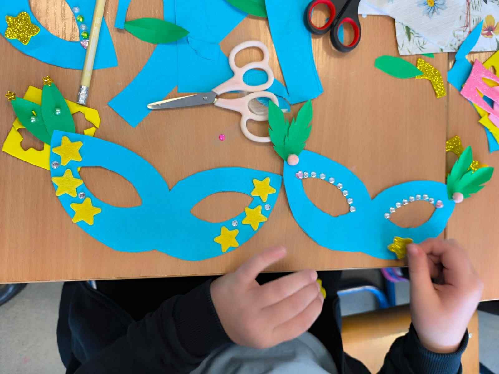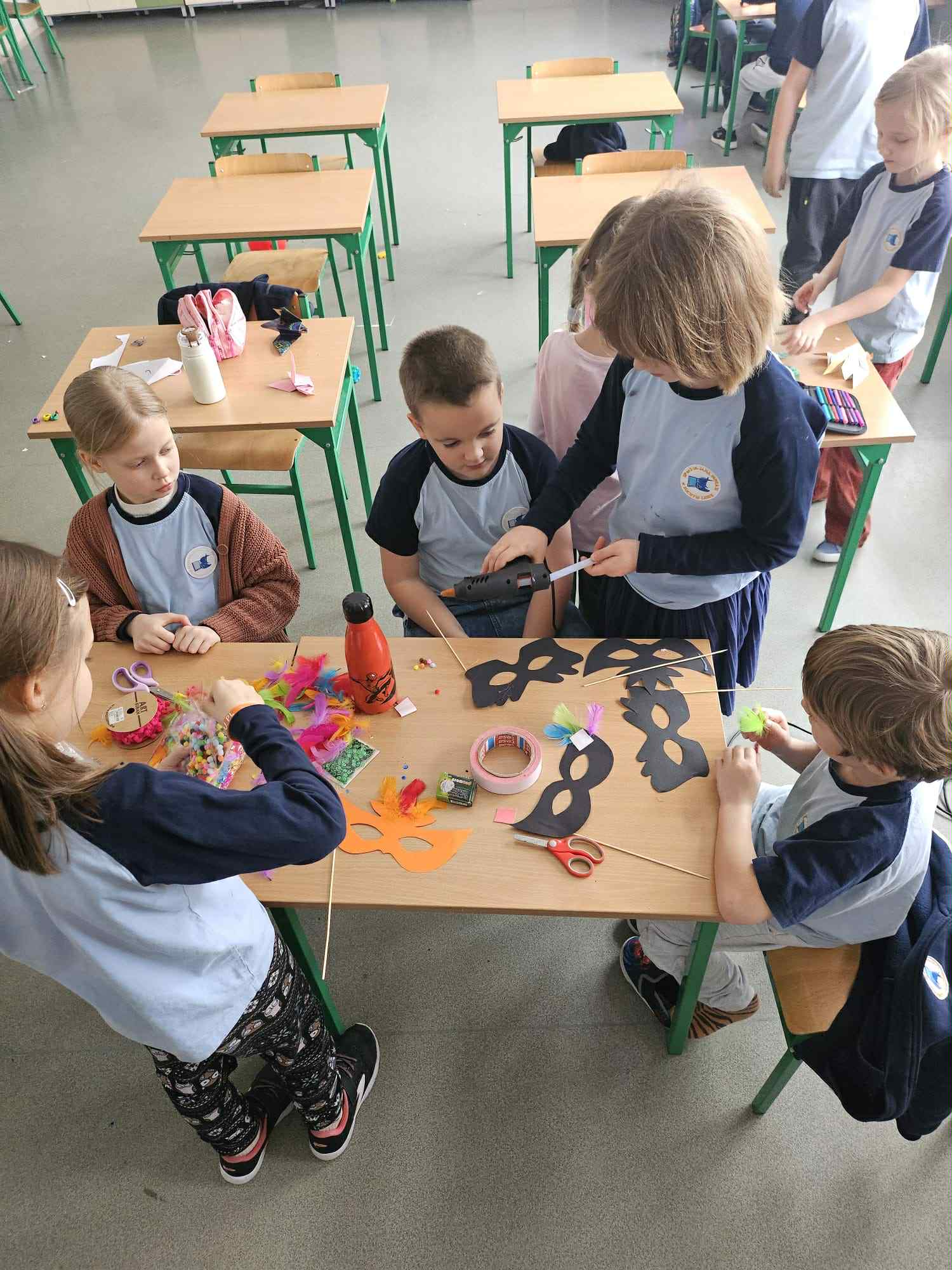 Nasi uczniowie w salach tworzyli prace plastyczne (maski karnawałowe, bałwanki z talerzyków, plakaty pingwinków...), bardzo chętnie tańczyli przy muzyce, ale także wyciszali się słuchając muzyki relaksacyjnej.