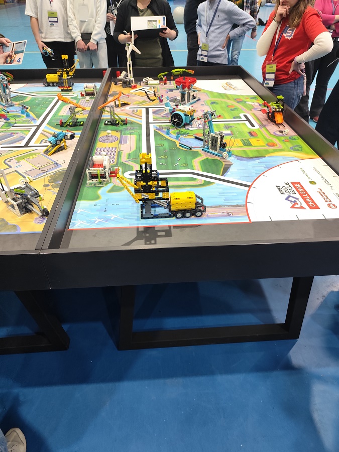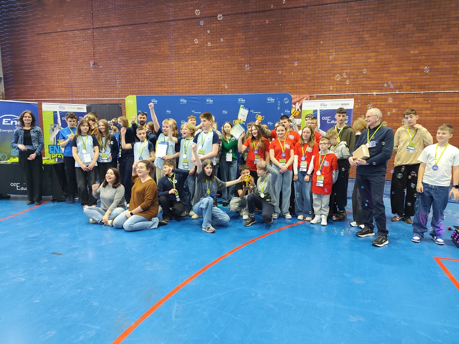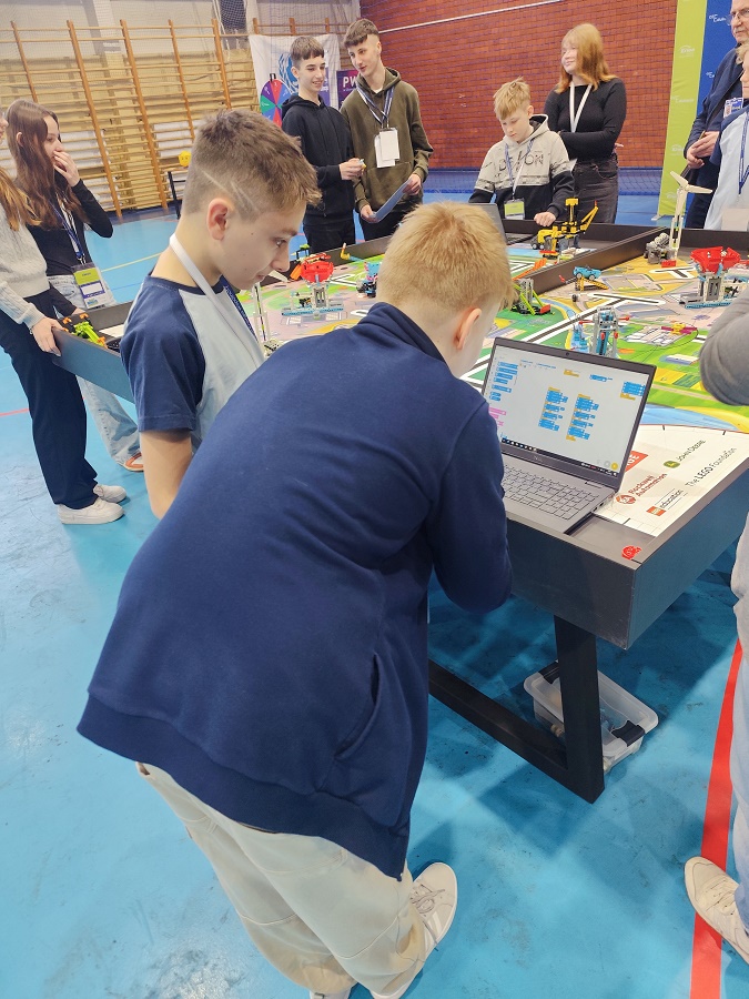 Równolegle uczniowie realizowali część technologiczną, budując i programując autonomicznego robota z zestawu LEGO® Education SPIKE Prime. Ich zadaniem było zaprojektowanie maszyny zdolnej do wykonywania misji na specjalnej planszy odwzorowującej rzeczywiste wyzwania energetyczne, takie jak produkcja, magazynowanie czy transport energii.