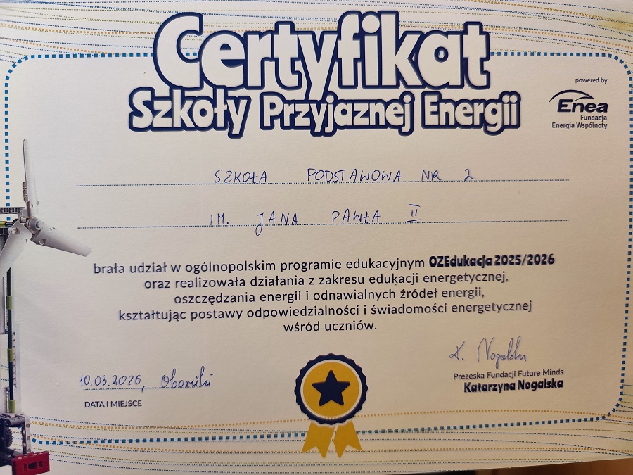 Zwieńczeniem działań było zdobycie certyfikatu „Szkoły Przyjaznej Energii” – prestiżowego wyróżnienia, które podkreśla wysoki poziom realizacji projektu oraz zaangażowanie uczniów. Co szczególnie istotne, w całej Polsce w programie uczestniczyło jedynie 45 szkół, co czyni to osiągnięcie jeszcze bardziej wyjątkowym.