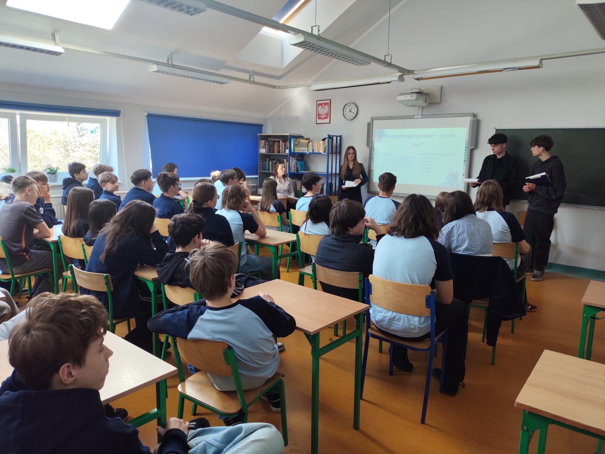 Podczas spotkania członkowie zespołu zaprezentowali projekt realizowany w ramach Olimpiady „Zwolnieni z Teorii”, przybliżając jego założenia oraz podejmowane działania. W przystępny i angażujący sposób omówili najważniejsze aspekty związane z tematyką niepełnosprawności. Wyjaśnili, czym jest niepełnosprawność, jakie są jej rodzaje, a także poruszyli zagadnienie neuroróżnorośności. Zwrócili również uwagę na bariery, z jakimi osoby z niepełnosprawnościami mierzą się na co dzień, zarówno w przestrzeni społecznej, jak i architektonicznej.