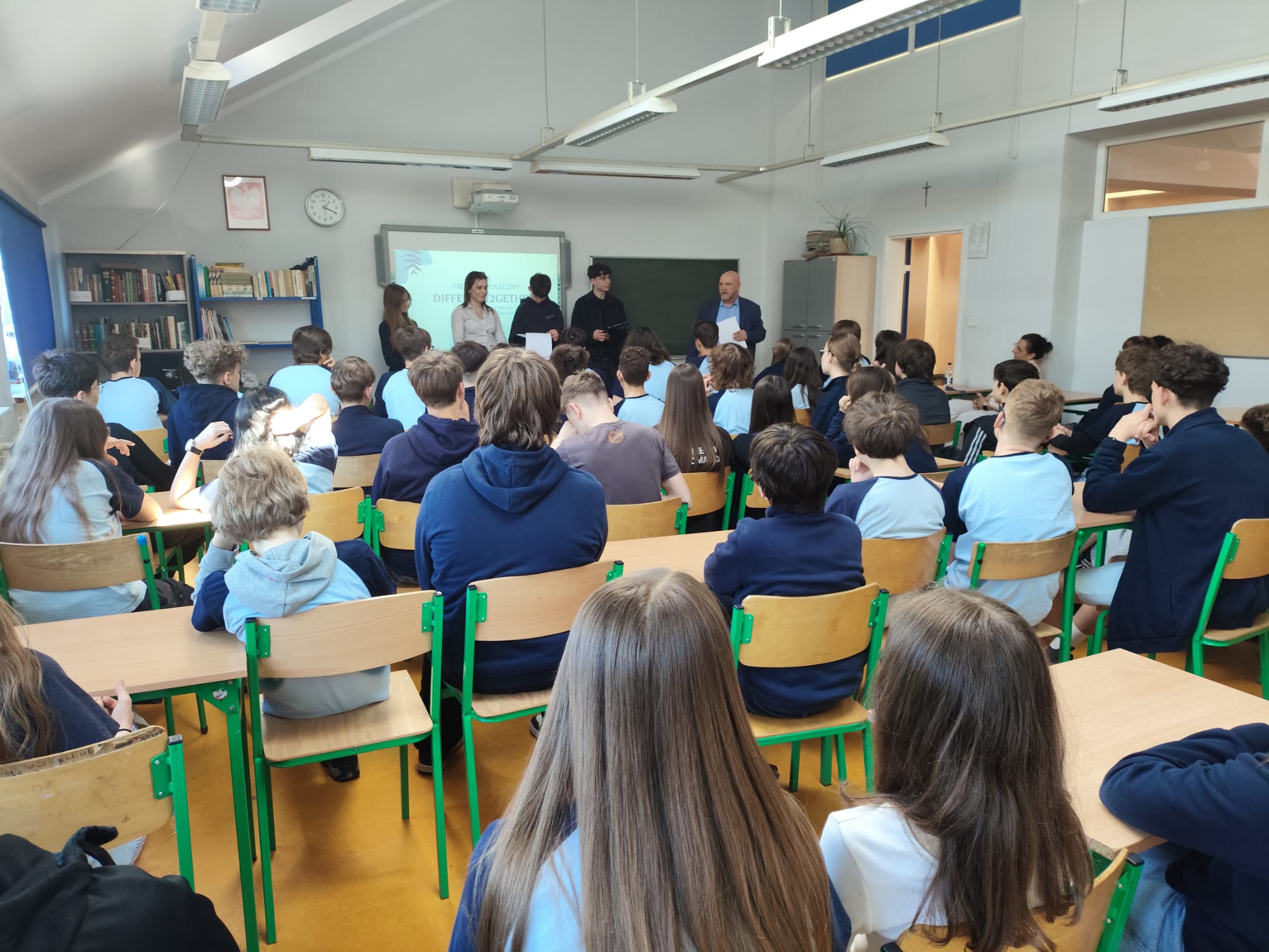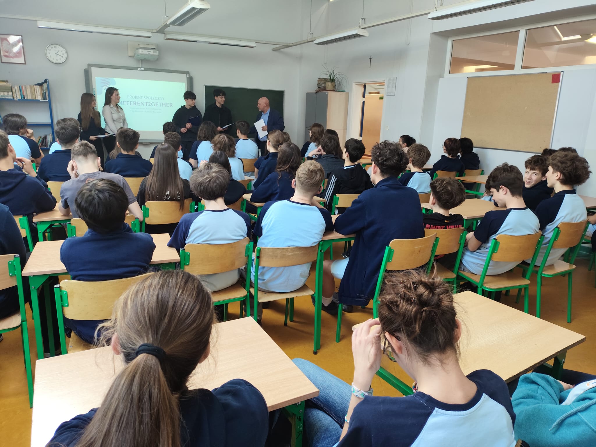 17 kwietnia w naszej szkole odbyła się prezentacja zespołu Different2gether, skierowana do uczniów klas 7 i 8. Zespół tworzą uczniowie II Liceum Ogólnokształcącego im. Generałowej Zamoyskiej i Heleny Modrzejewskiej w Poznaniu, a wśród nich Filip i Tymon, absolwenci naszej szkoły.