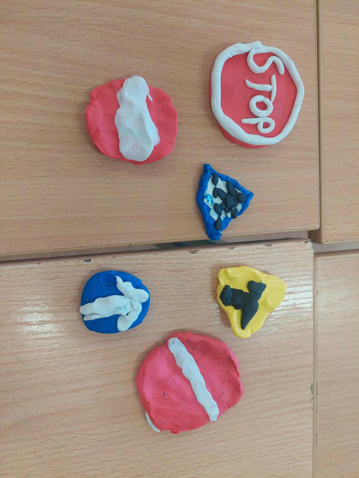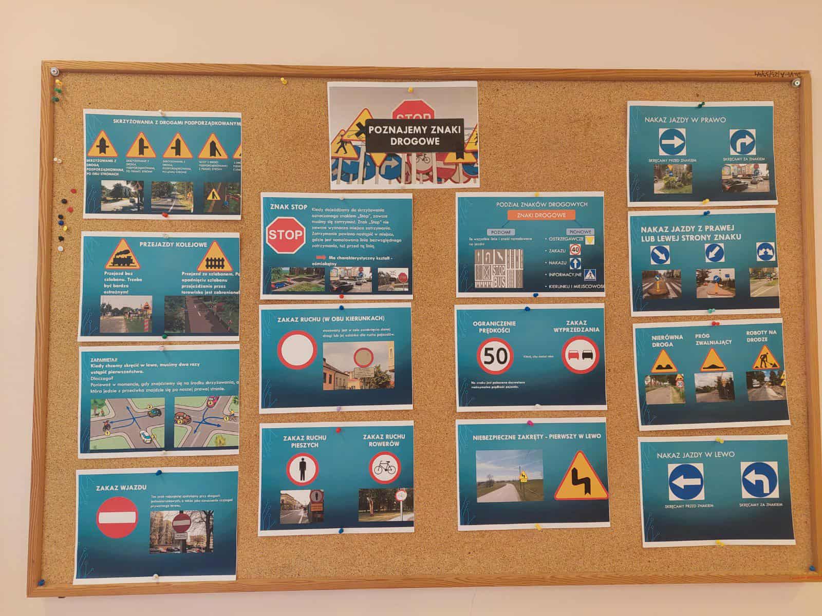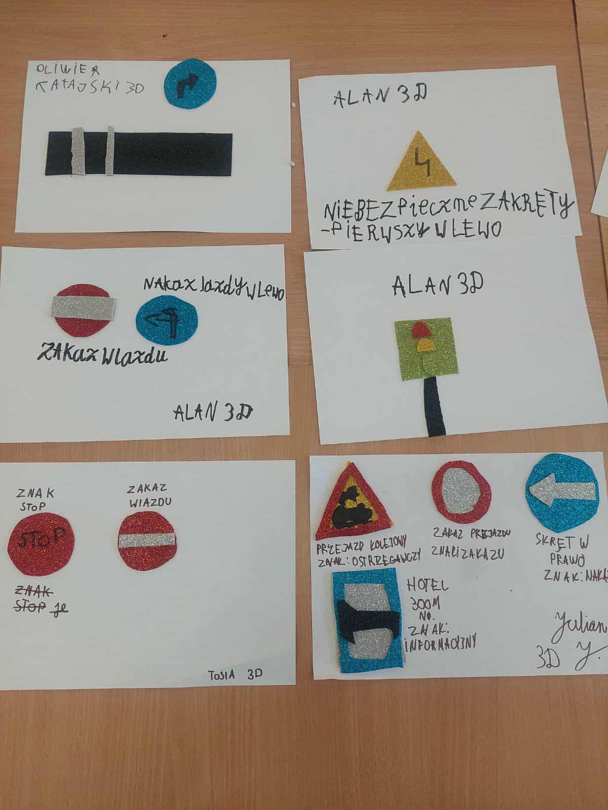 Wspólnie omawialiśmy zasady bezpieczeństwa obowiązujące na terenie szkoły oraz w drodze do i z niej, poznaliśmy znaki drogowe, co utrwaliliśmy poprzez samodzielne wykonanie znaków drogowych przez dzieci.