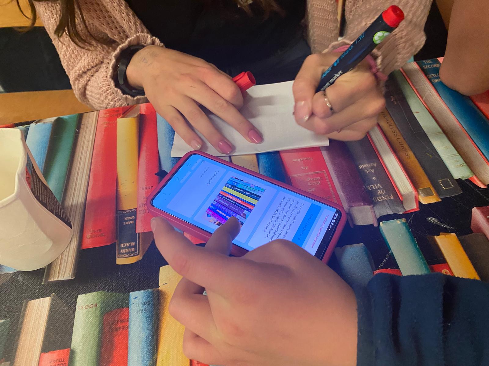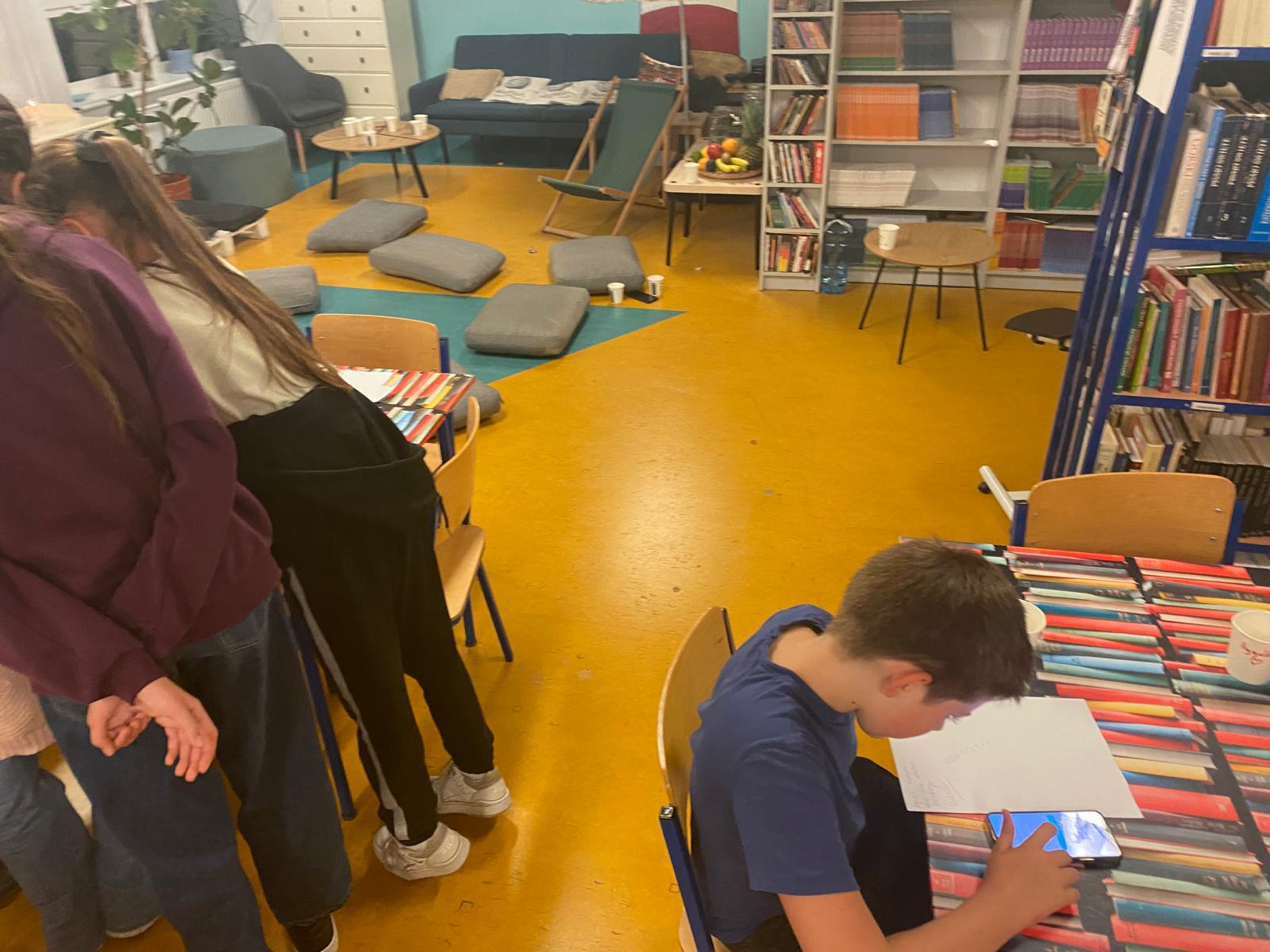 Nie zabrakło również chwili relaksu – gier słownych, takich jak czółko, oraz wspólnej pizzy i ciasteczek, które przyniosła jedna z uczestniczek, Zuzia (dziękujemy!). Na zakończenie odbyła się sesja fotograficzna w kartonie z wykorzystaniem green screenu – zdjęcia wyszły fantastycznie i na długo pozostaną pamiątką po tym wieczorze.
