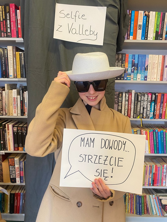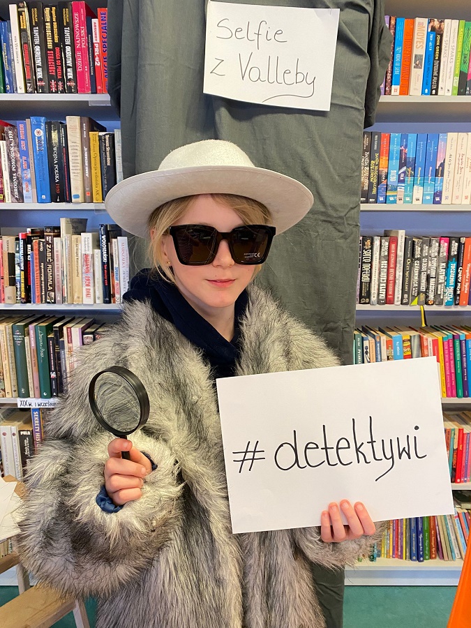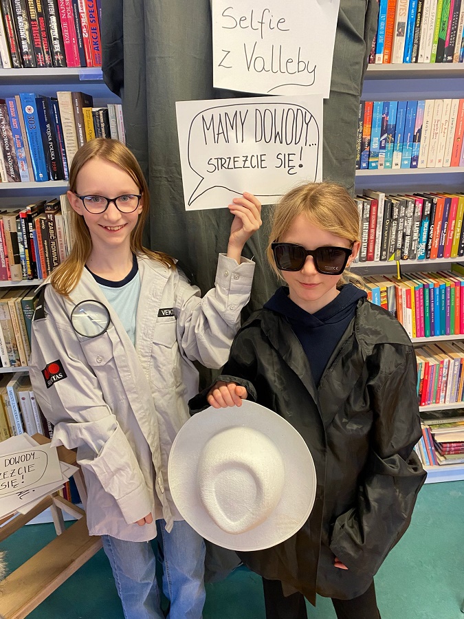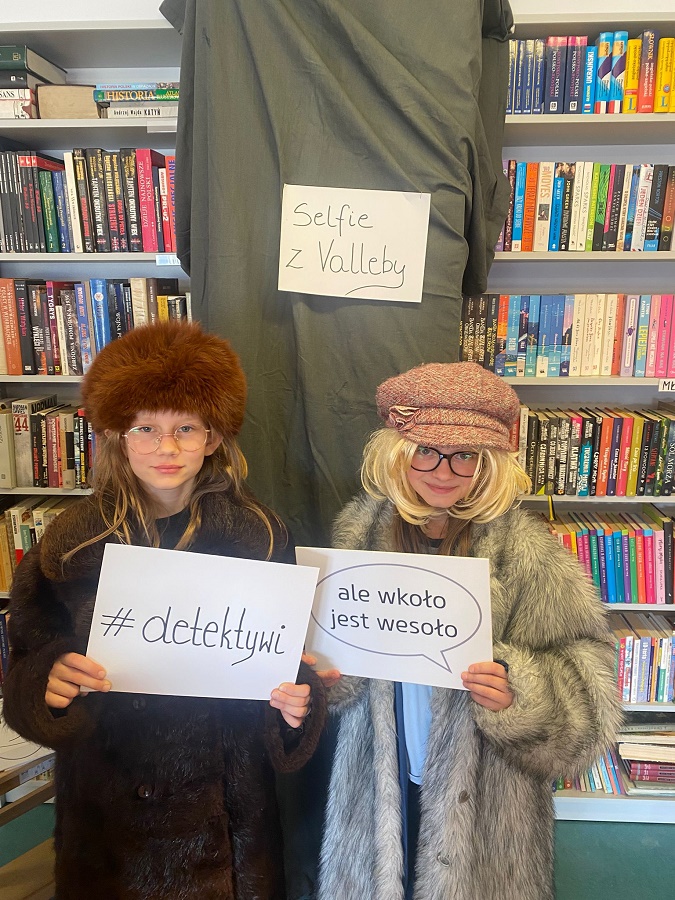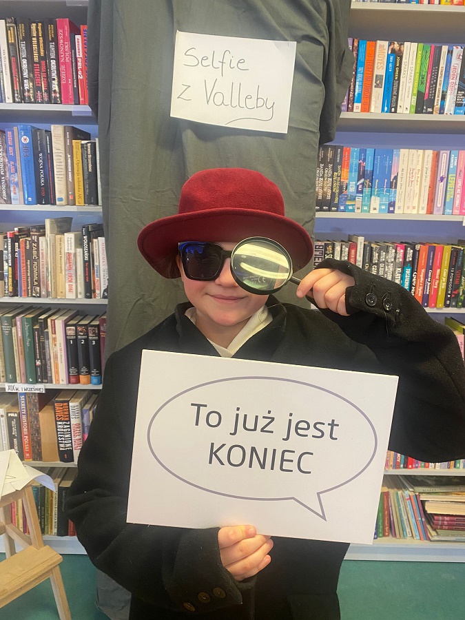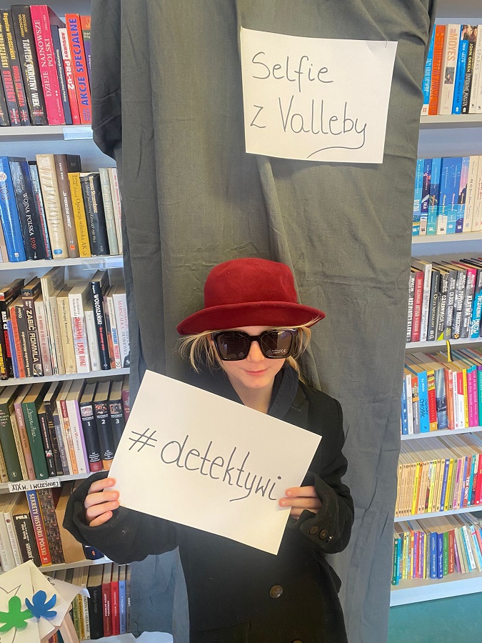 Ogromnym powodzeniem cieszyła się strefa fotograficzna „Selfie z Valleby”. To właśnie tam można było przenieść się do miasteczka Valleby i choć na chwilę poczuć się jak bohater opowieści o Lassem i Mai. Przygotowałyśmy ściankę do zdjęć oraz zestaw detektywistycznych rekwizytów – płaszcze, kapelusze, lupy, okulary i wiele innych dodatków. Nie zabrakło również zabawnych tabliczek z hasłami, które uczniowie chętnie wykorzystywali podczas robienia zdjęć.