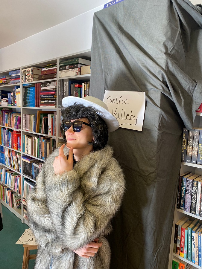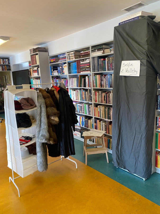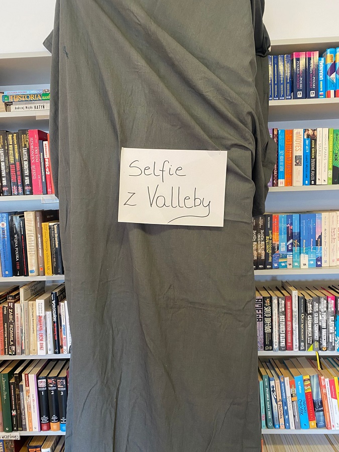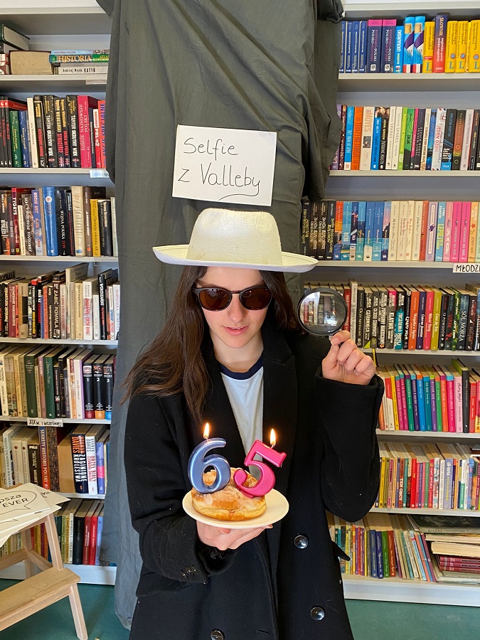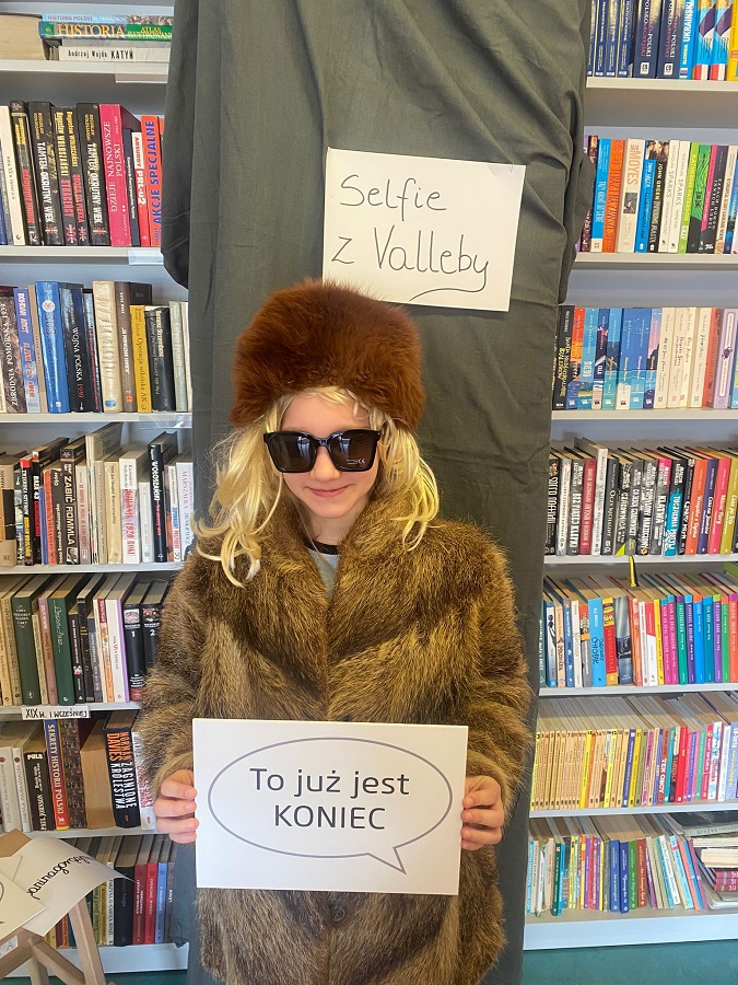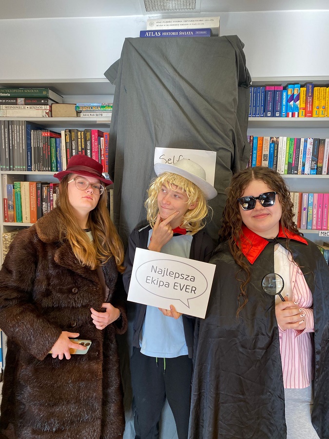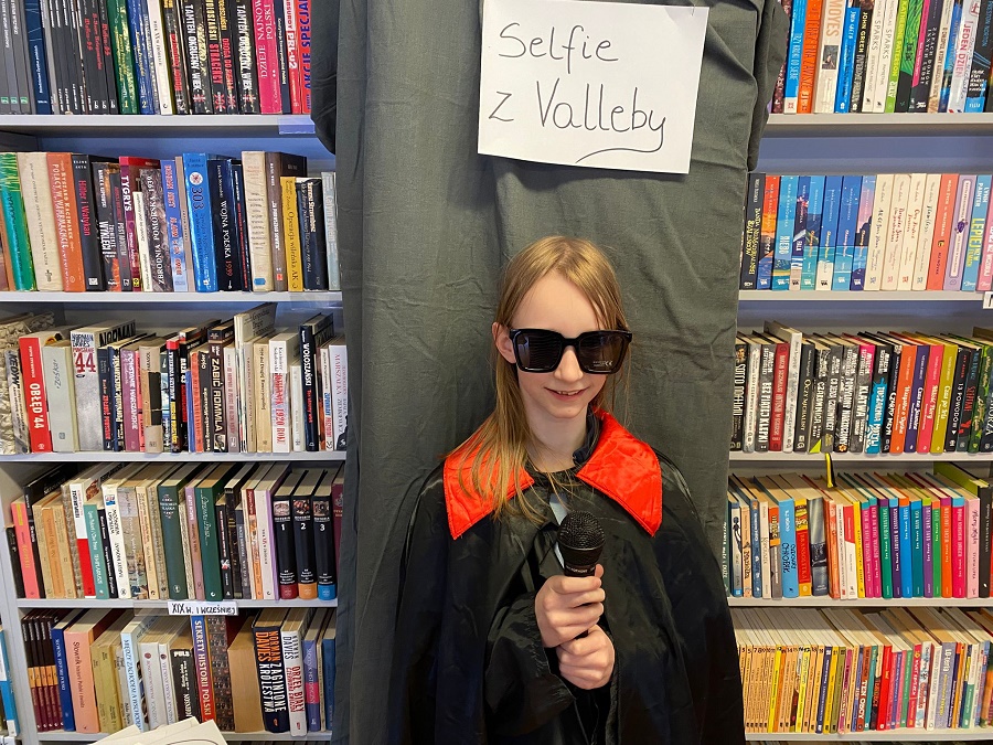 Ogromnym powodzeniem cieszyła się strefa fotograficzna „Selfie z Valleby”. To właśnie tam można było przenieść się do miasteczka Valleby i choć na chwilę poczuć się jak bohater opowieści o Lassem i Mai. Przygotowałyśmy ściankę do zdjęć oraz zestaw detektywistycznych rekwizytów – płaszcze, kapelusze, lupy, okulary i wiele innych dodatków. Nie zabrakło również zabawnych tabliczek z hasłami, które uczniowie chętnie wykorzystywali podczas robienia zdjęć.