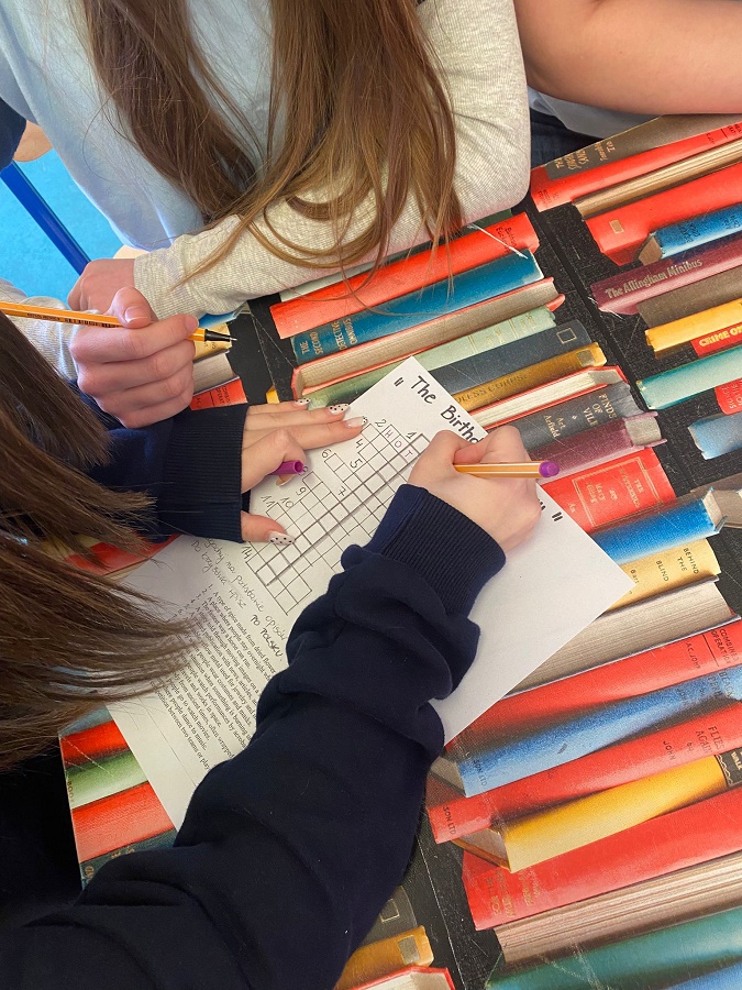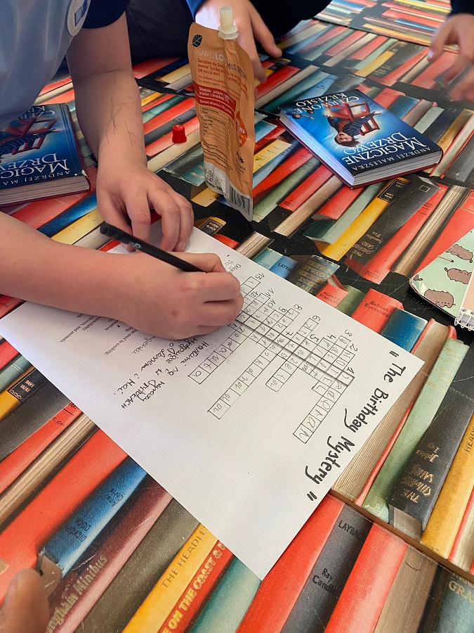 Nie zabrakło również wyzwań dla miłośników zagadek. W „Biurze szyfrów i zagadek” uczniowie mierzyli się z krzyżówką, której rozwiązanie wymagało sprytu, współpracy i odrobiny językowej odwagi. Podpowiedzi zostały przygotowane w języku angielskim, co dla niektórych było dodatkowym wyzwaniem, ale – jak się okazało – uczestnicy świetnie sobie poradzili, chętnie korzystając z dostępnych narzędzi i wzajemnej pomocy.