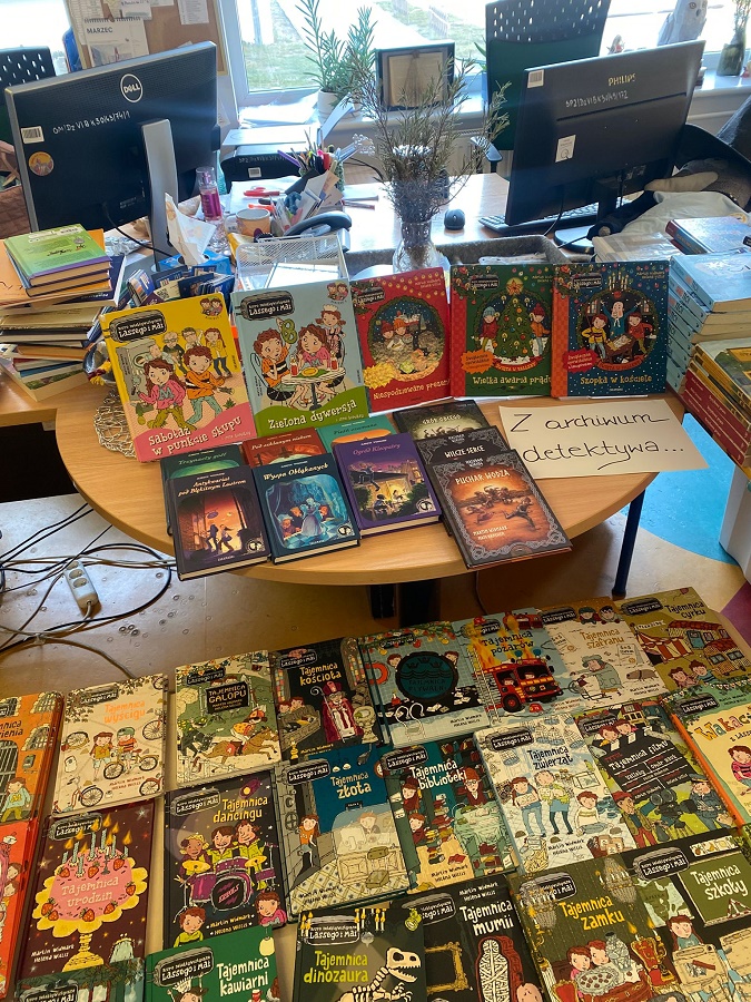 Już od wejścia na uczestników czekała specjalnie przygotowana przestrzeń inspirowana twórczością autora. Centralnym punktem była wystawa książek – nasze „Archiwum detektywa”. Zgromadziłyśmy wszystkie dostępne tytuły, które nie tylko przyciągały wzrok, ale również stanowiły wskazówki do rozwiązywania przygotowanych zadań. Uczniowie z zainteresowaniem przeglądali książki, szukając tropów i odpowiedzi.