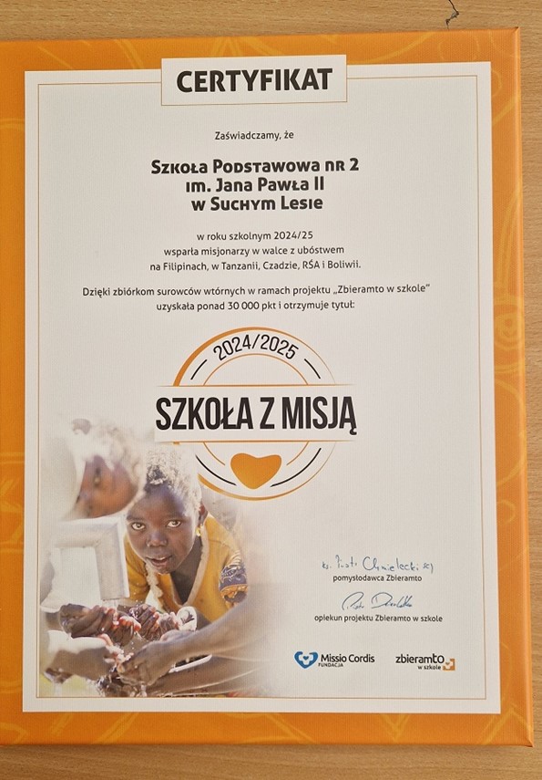 Podczas wakacji na ręce opiekuna SKC dotarł certyfikat przyznający naszej szkole tytuł: SZKOŁA Z MISJĄ.