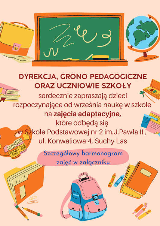 Serdecznie zapraszamy dzieci rozpoczynające od września naukę w klasie pierwszej na zajęcia adaptacyjne, które odbędą się w budynku szkoły przy ul.Konwaliowej 4 w terminie 02-06.02.2026.