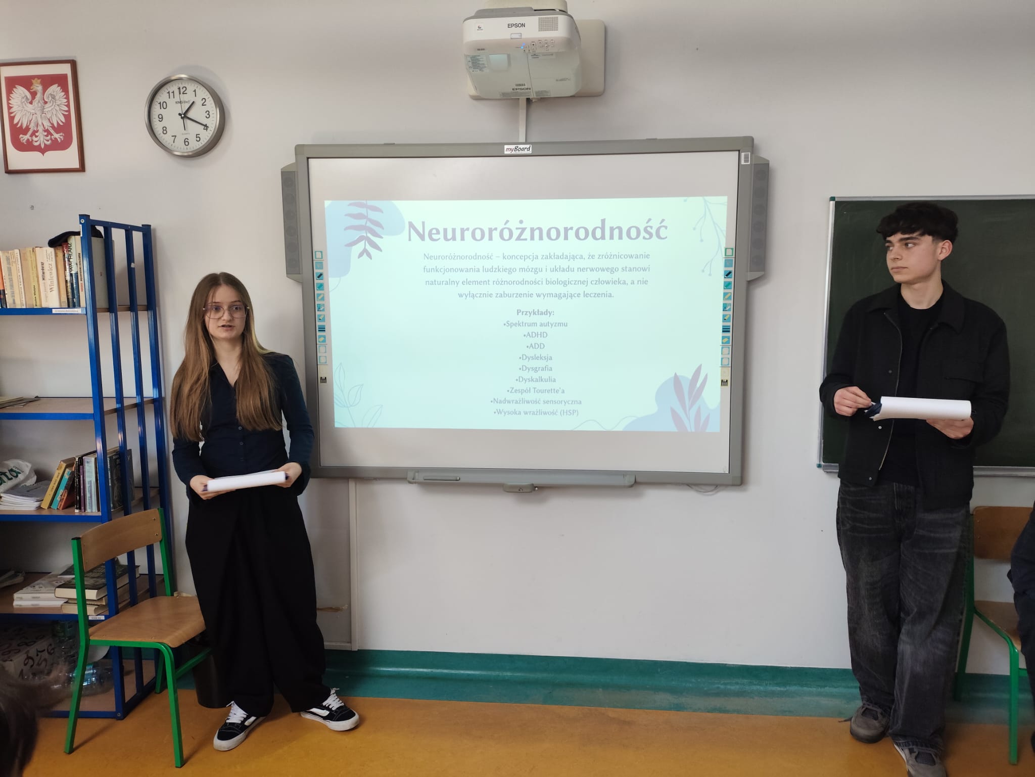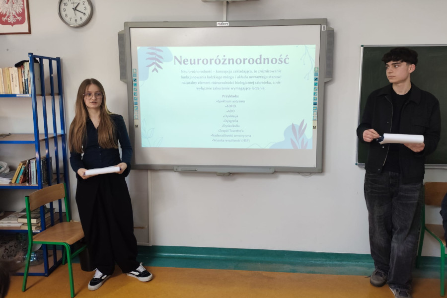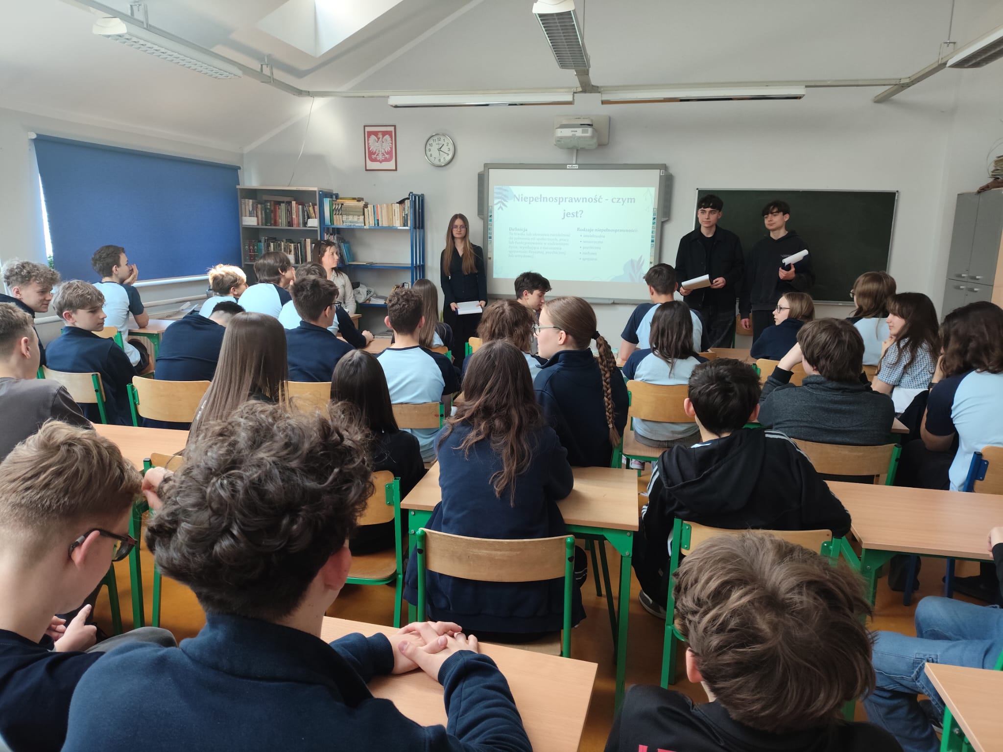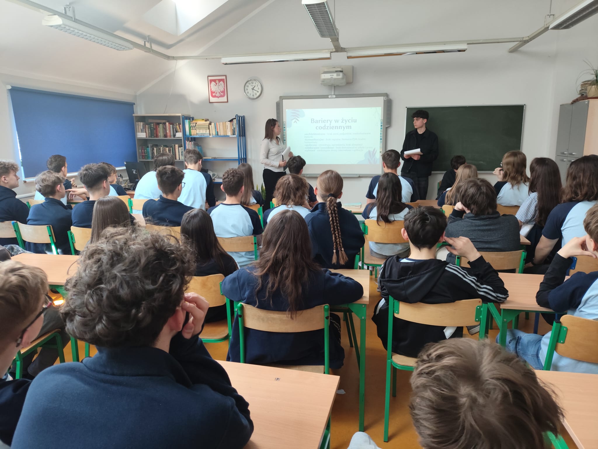 Podczas spotkania członkowie zespołu zaprezentowali projekt realizowany w ramach Olimpiady „Zwolnieni z Teorii”, przybliżając jego założenia oraz podejmowane działania. W przystępny i angażujący sposób omówili najważniejsze aspekty związane z tematyką niepełnosprawności. Wyjaśnili, czym jest niepełnosprawność, jakie są jej rodzaje, a także poruszyli zagadnienie neuroróżnorośności. Zwrócili również uwagę na bariery, z jakimi osoby z niepełnosprawnościami mierzą się na co dzień, zarówno w przestrzeni społecznej, jak i architektonicznej.